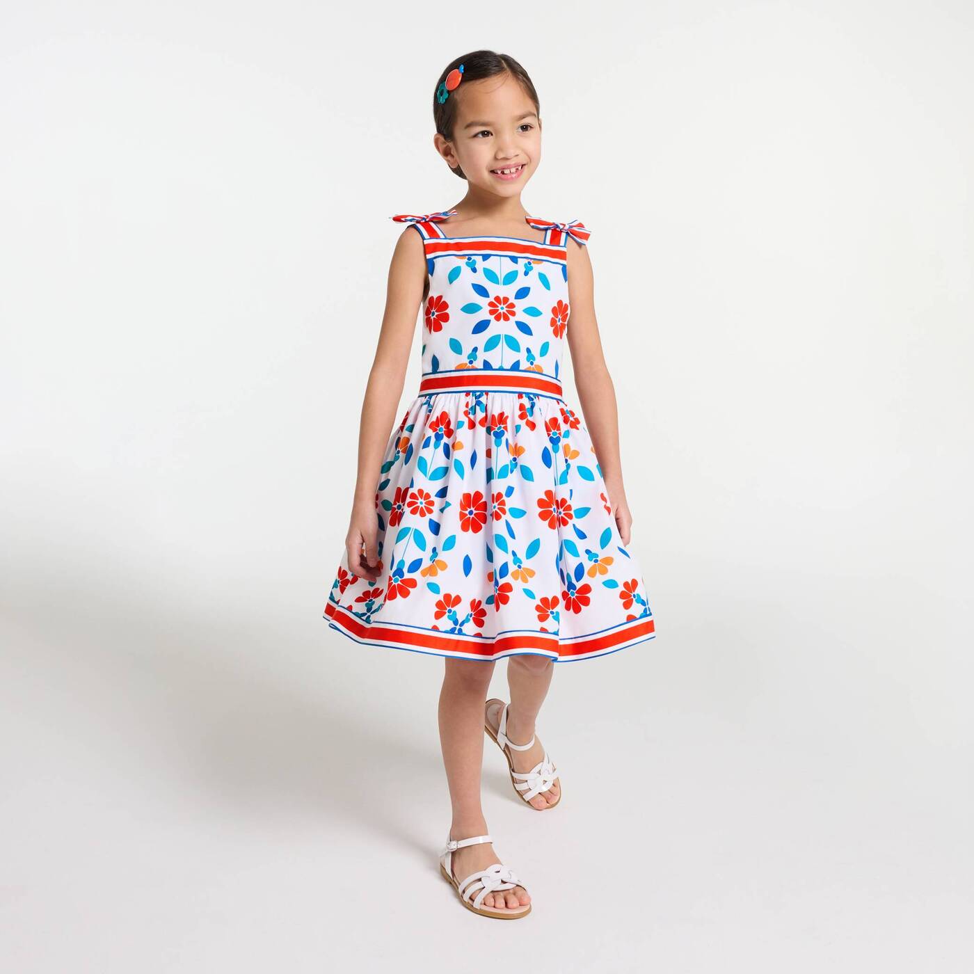 Worn at the height of summer, this perfectly-cut, retro-chic girl dress will be part of every outing. Enhanced by straps with applied bow and striped inserts, geometric motifs and vibrant colours finalise this riviera-inspired piece to slip into the suitcase for vacation.