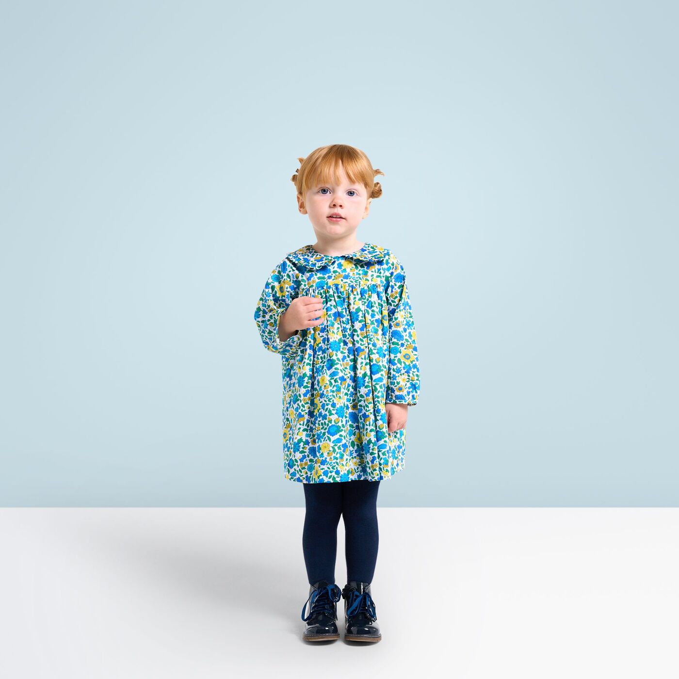 Iconic of the Jacadi wardrobe, this Liberty fabric baby dress is unveiled in a velvet version for autumn. Adorned with a ruffled Peter Pan collar, gathered suspended waist and bracelet sleeves sublimate this chic, floral piece to match with a British coat for a silhouette full of authenticity.