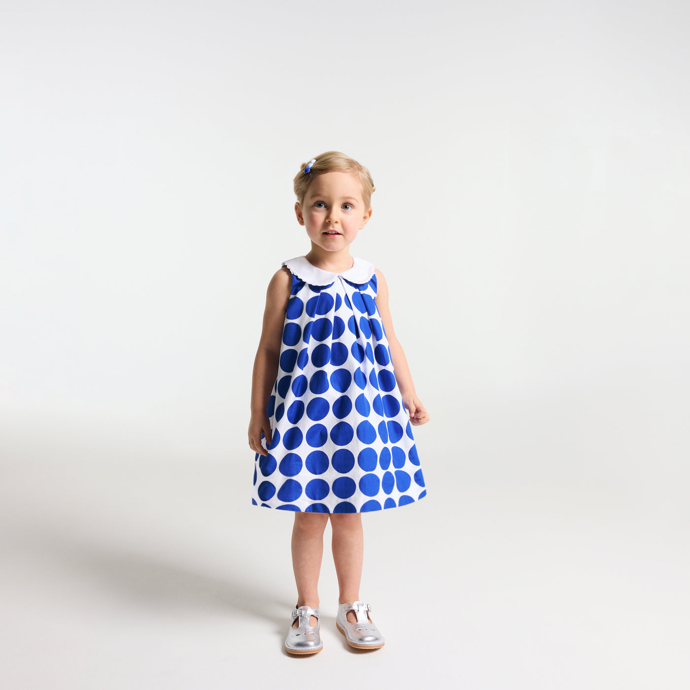 Geometric and romantic, this baby girl dress rivals originality. Sleeveless and beautifully striped for a hypnotic silhouette, a cross-over back structures this piece to be worn in the heart of summer with a pretty hat for vacations and celebrating upcoming events.