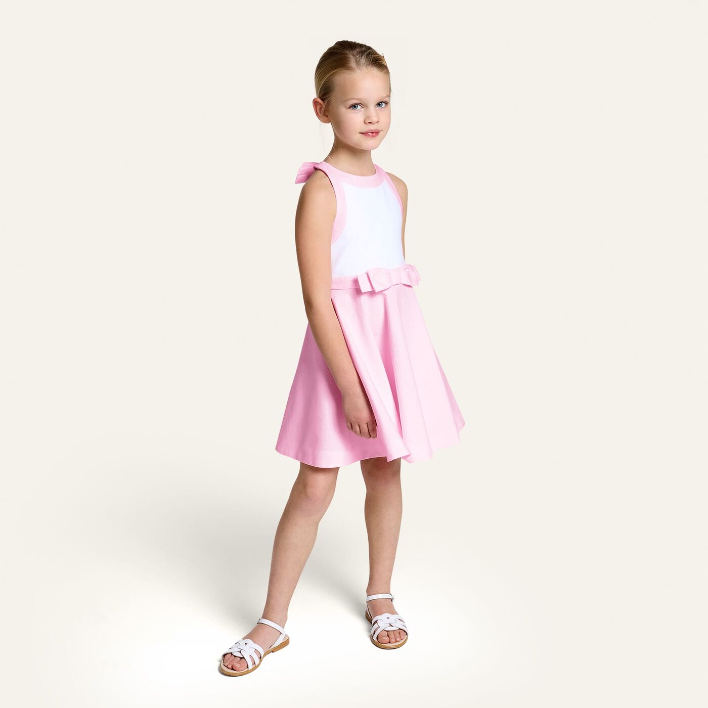 This honeycomb cotton ceremony dress is perfect for all your summer invitations. The flared cut and defined waist, bow detail at the waistband and halter neck embellished with small bows add delightful couture details. An elegant and sophisticated design that your daughter will twirl around in on the big day.