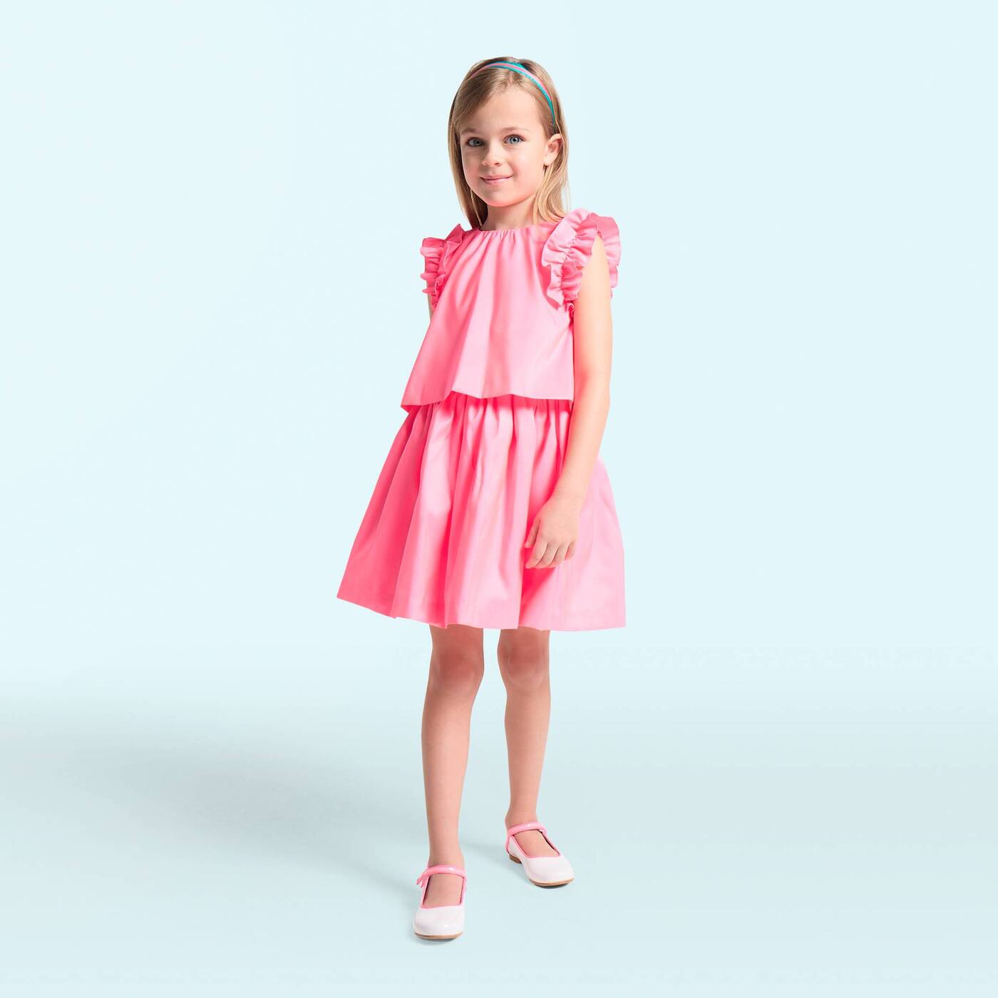 An ode to fine craftsmanship and in-house know-how, our designers have created chic pieces for special occasions, like this girl top. Made from Italian taffeta in a contemporary neon pink, it features ruffled armholes and small pleats for a couture silhouette. Coordinate it with a satin skirt in a wave motif, and you've got a perfect outfit for the big day.