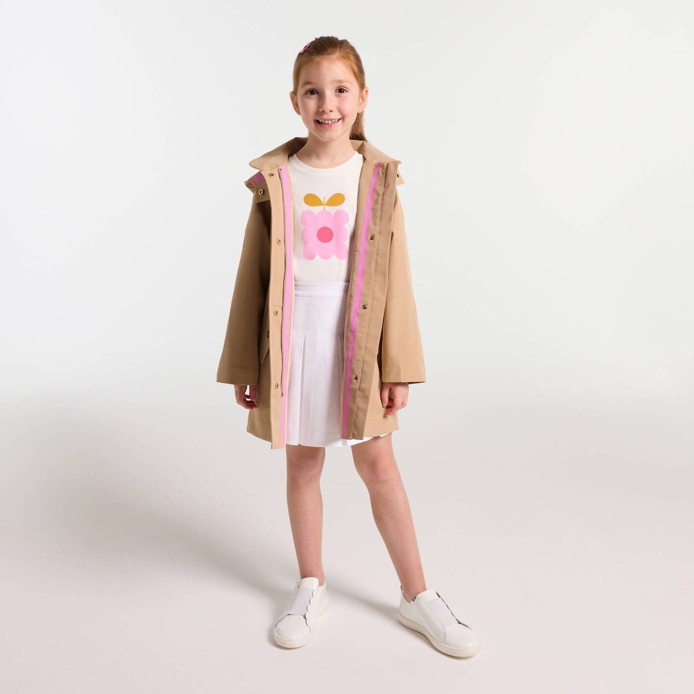 A preppy breeze blows through the little girl's wardrobe with this pleated skirt. Available in cotton gabardine, its soft white color will match a t-shirt from the end of summer and a sweatshirt and sneakers at the start of the school year for an English college look.