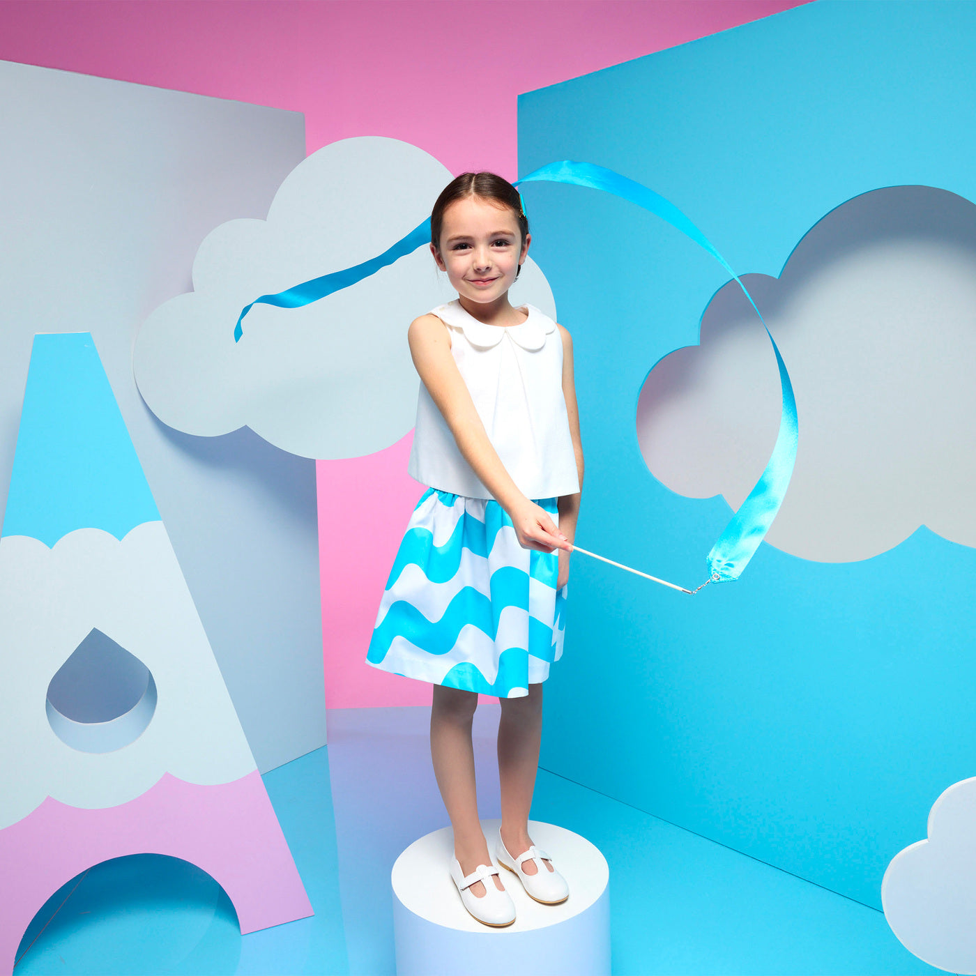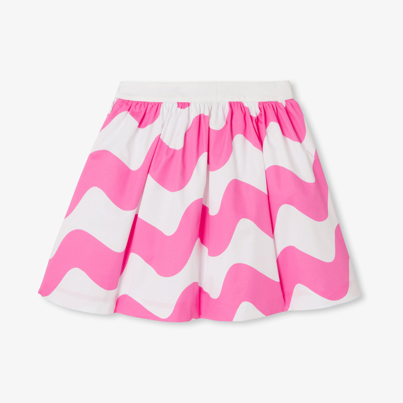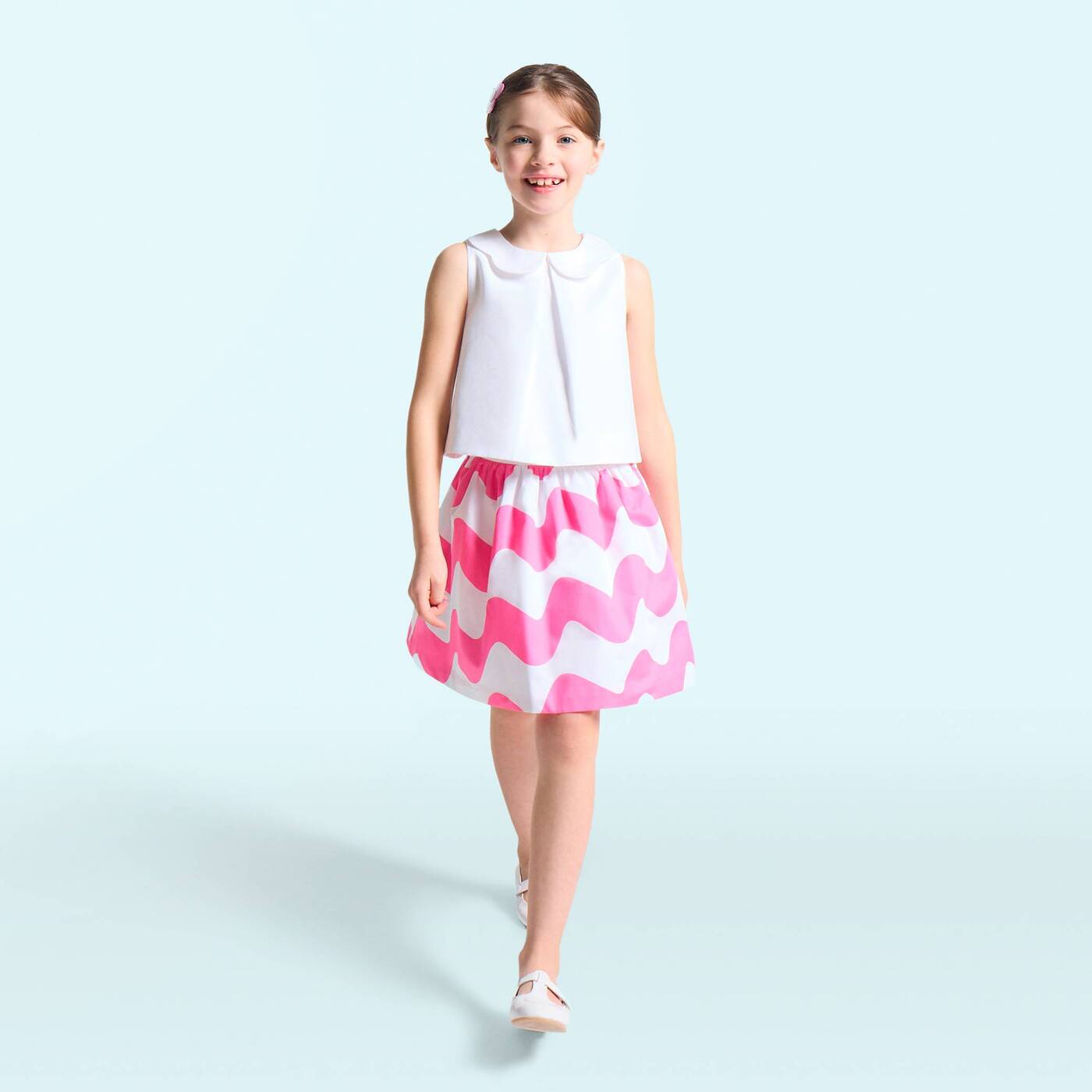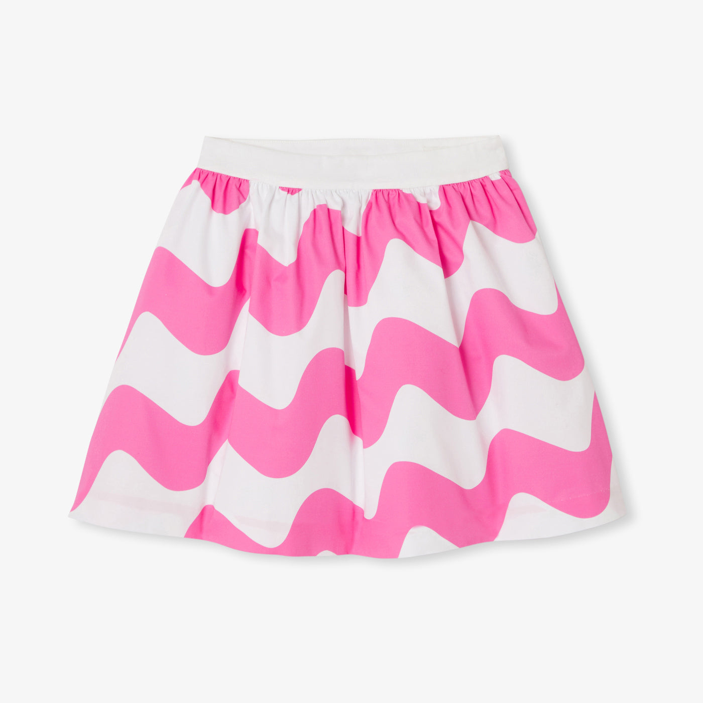 Elegant and contemporary, this girl skirt comes in a delightful satin cotton. Featuring a mesmerizing wave pattern, gathered waistband and lining, this chic piece, to be worn with a halter top and sandals, will be perfect for a midsummer ceremony.
