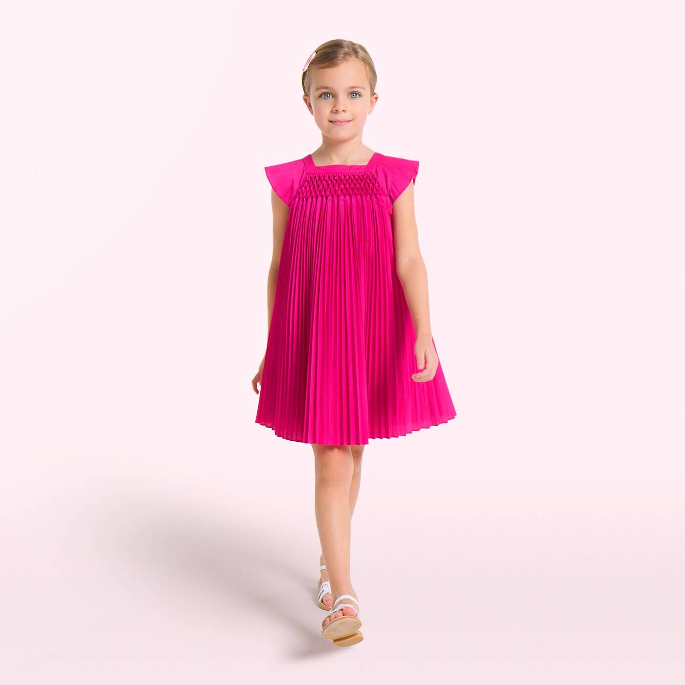 With its innate sense of chic and intricate detailing, this girl formal dress is the perfect summer style. Resolutely contemporary with its embroidered permanent pleats at the neckline and ruffled sleeves, available in powder pink or fuchsia, match this couture piece with a taffeta headband and sandals to compose her ceremony outfit.