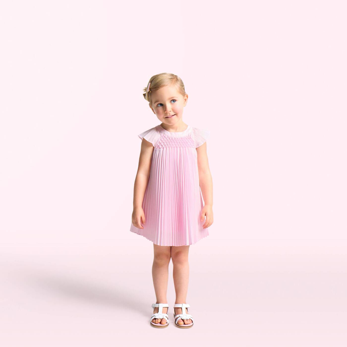With its innate sense of chic and intricate detailing, this girl formal dress is the perfect summer style. Resolutely contemporary with its embroidered permanent pleats at the neckline and ruffled sleeves, available in powder pink or fuchsia, match this couture piece with a taffeta headband and sandals to compose her ceremony outfit.