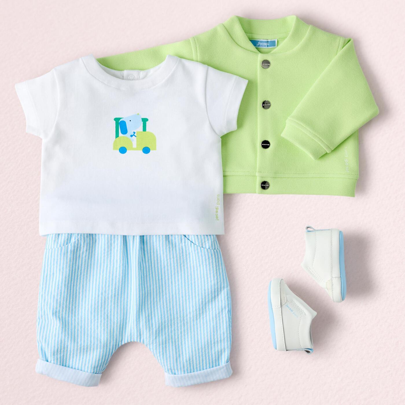 Casual chic and comfortable, our baby boy trousers are ready for summer. Available in a comfortable, embossed seersucker fabric, they are lined in poplin for maximum comfort. Coordinated with a t-shirt and a Varsity-style cardigan for a fashionable look, you will love this practical new baby-friendly model.