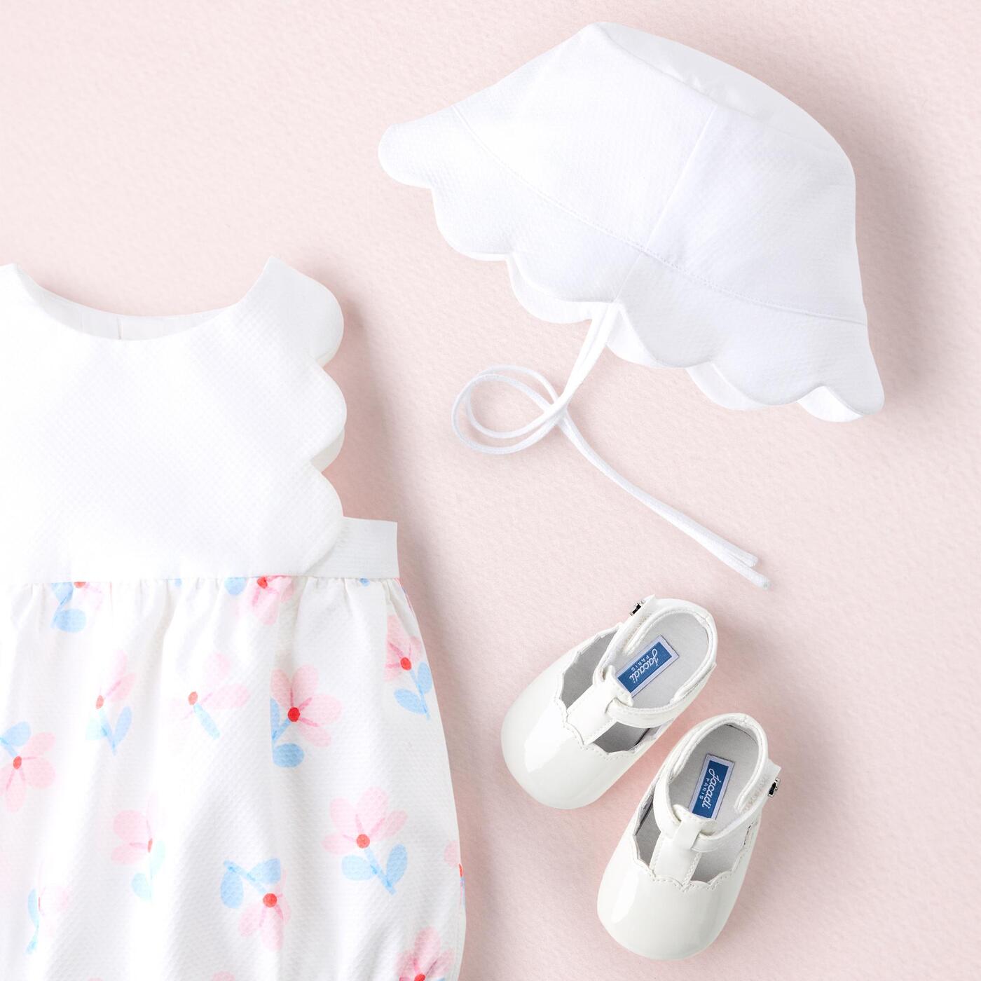 The timeless baby girl romper opts for a romantic chic look for spring. With its cotton piqué fabric, scalloped top, gathered waist for volume and a sheer floral print bloomer, this piece is easy to slip on thanks to its back and crotch openings. Paired with a hat and ballet flats, it is a lovely birth gift and a great idea for formal wear.